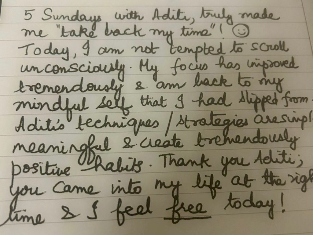 5 Sundays with Aditi truly made me “take back my time”! Today, I am not tempted to scroll unconsciously. My focus has improved tremendously & am back to my mindful self that I had slipped from. Aditi’s framework/strategies are simple, meaningful & create tremendously positive habits. Thank you, Aditi, you came into my life at the right time & I fell FREE today!