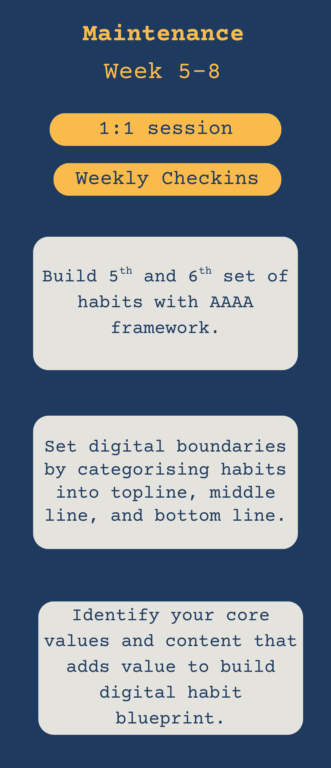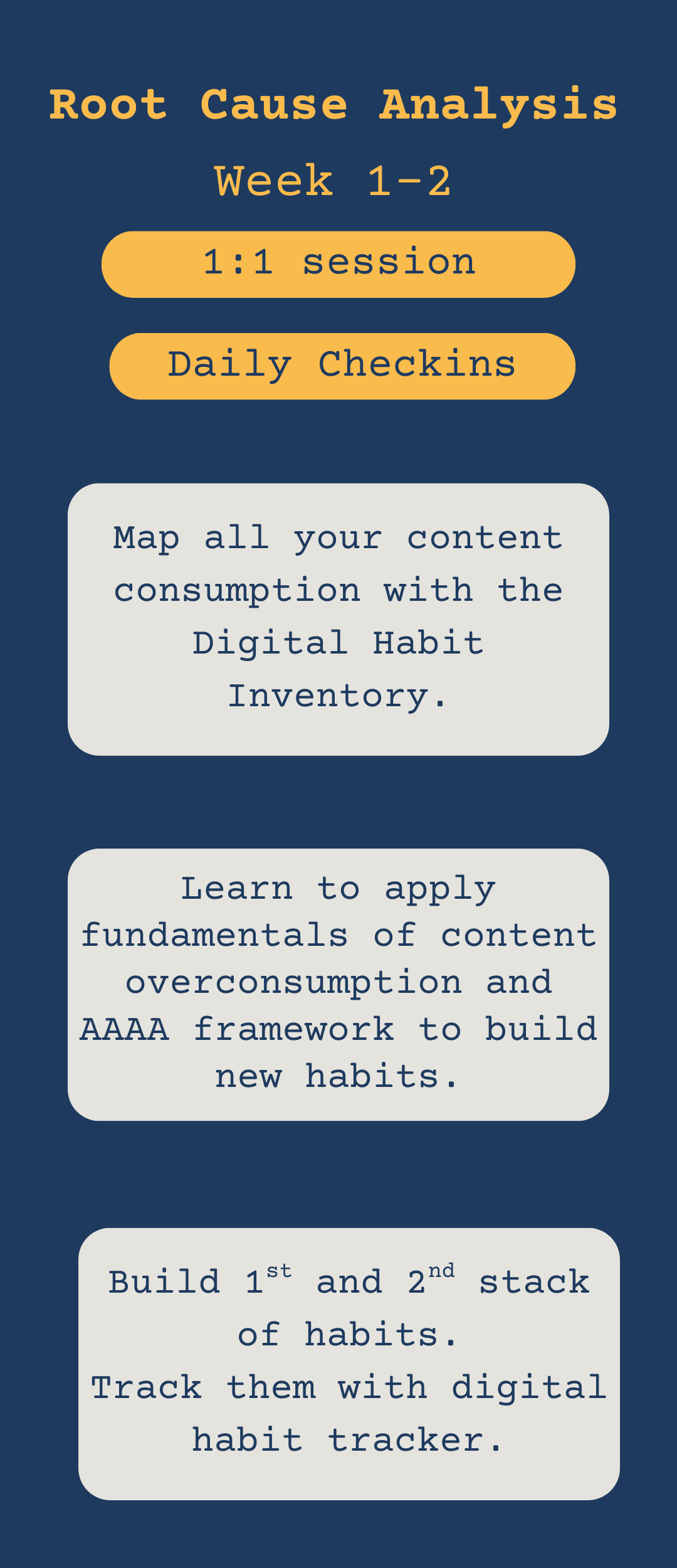 We don’t fix all your digital habits at once. Each week, you focus on just one type of content consumption and build simple habits around it. You work on maintaining consistency for the next 24 hours, so it’s not overwhelming.